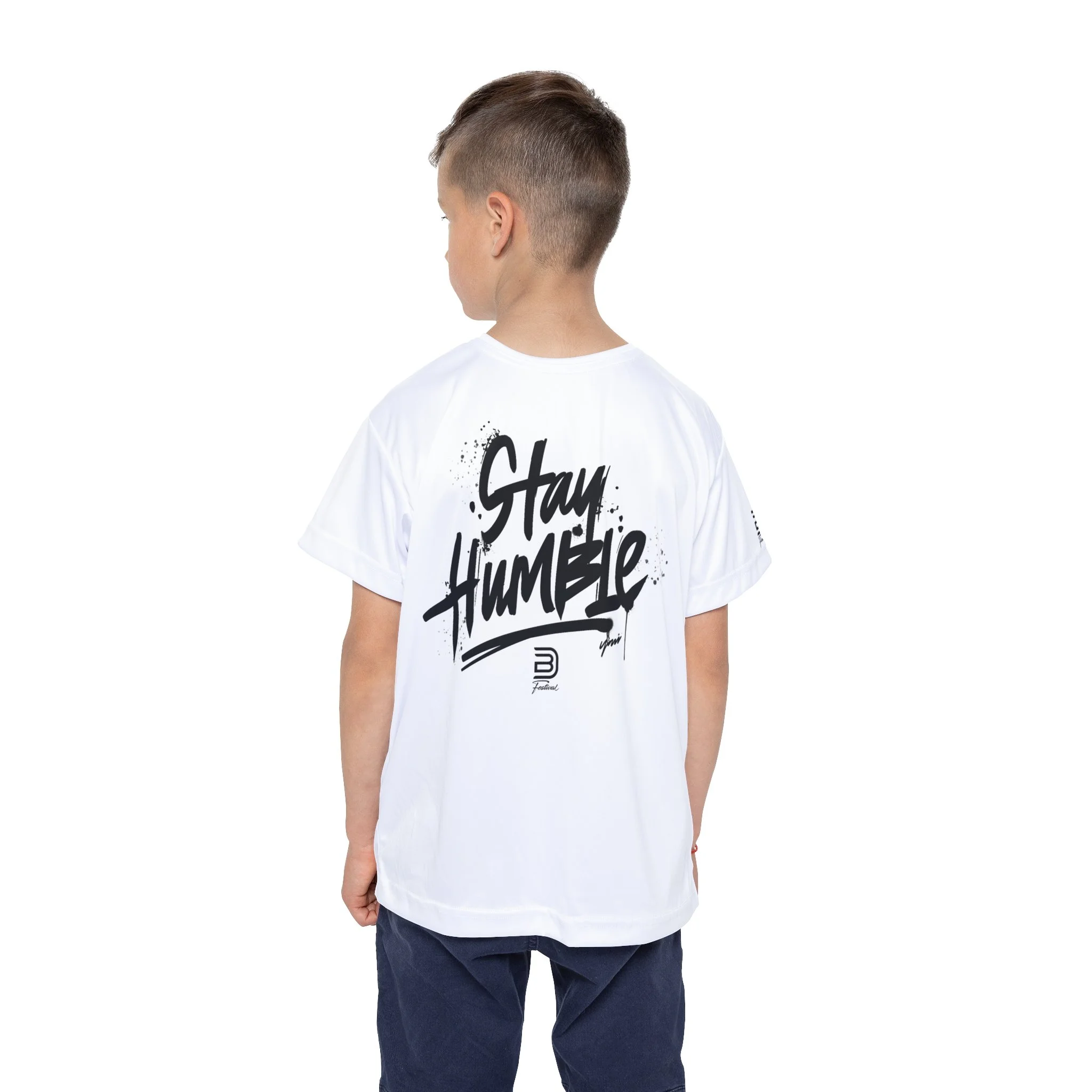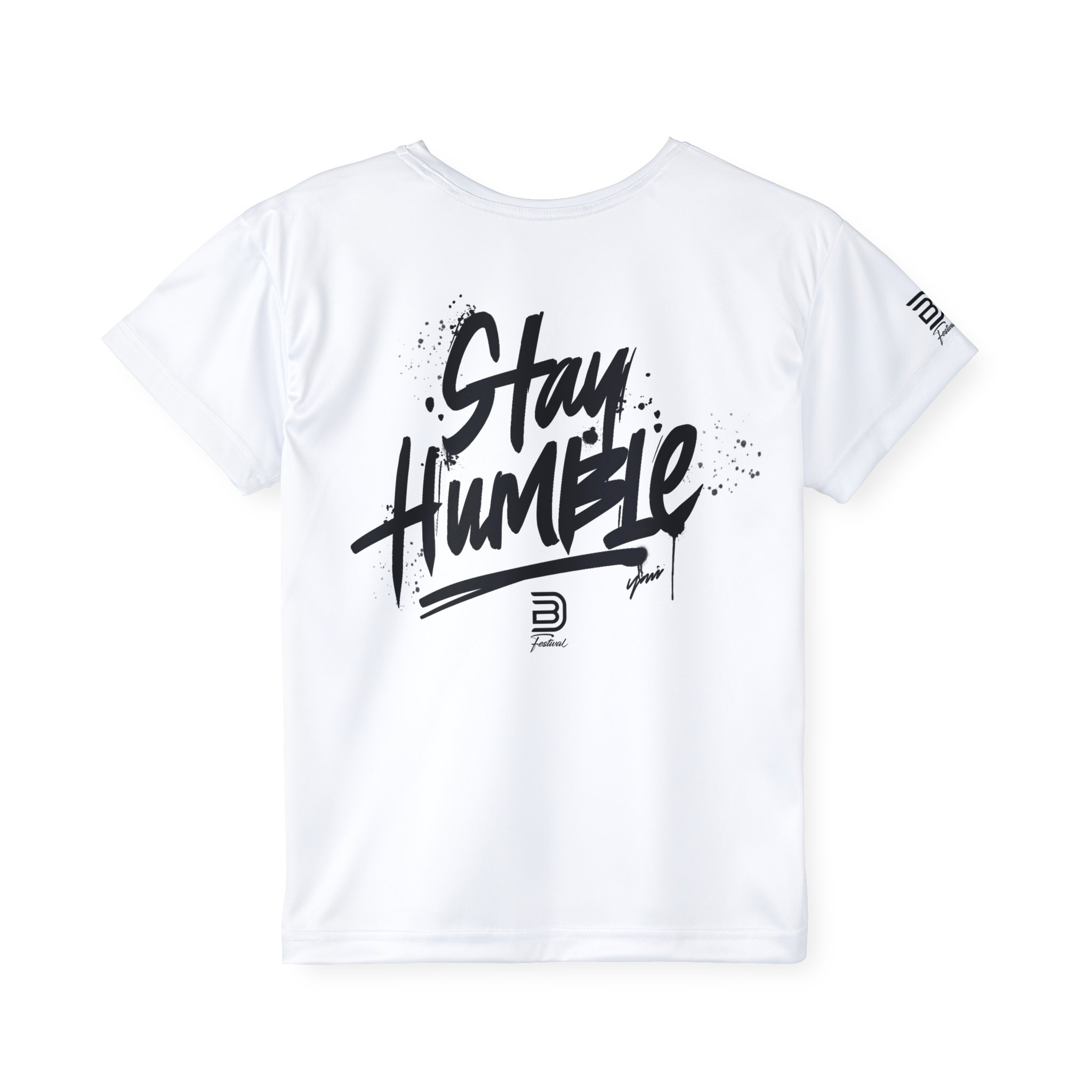 Lightweight, performance-ready kids’ jersey designed for young movers who live for dance rehearsals, rec league games, and festival weekends. The front wears a clean, bold event logo while the back carries an energetic handwritten “Stay Humble” graphic — a subtle reminder to stay grounded between cheers and high-fives. Breathable, moisture-wicking polyester keeps skin dry during long practices. The ribbed collar and armholes stretch for quick on/off and snap back into shape so the fit stays tidy through tumble runs and spin-outs. Crisp printing keeps the black artwork vivid against the white athletic fabric, and the printed size/care label prevents itch at the neckline. Pack this into a weekend bag for competitions, layer it under a zip hoodie for chilly warm-ups, or let it be the go-to tee for after-party hangs with teammates.